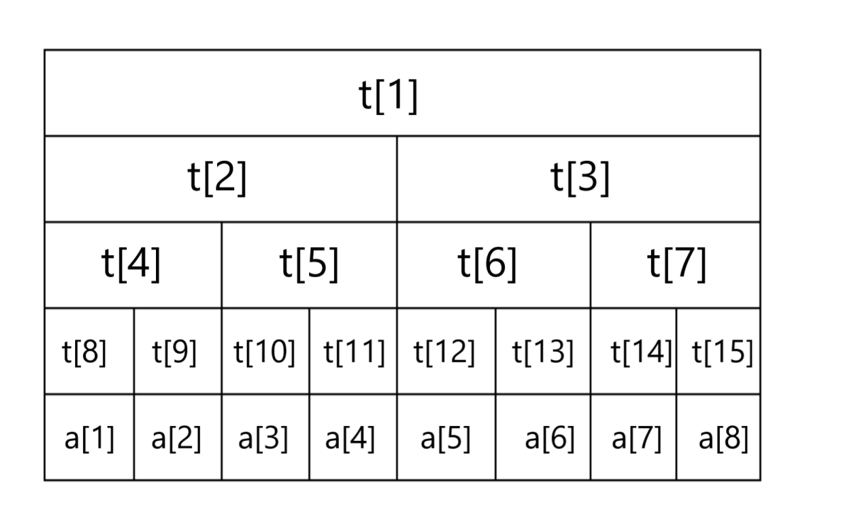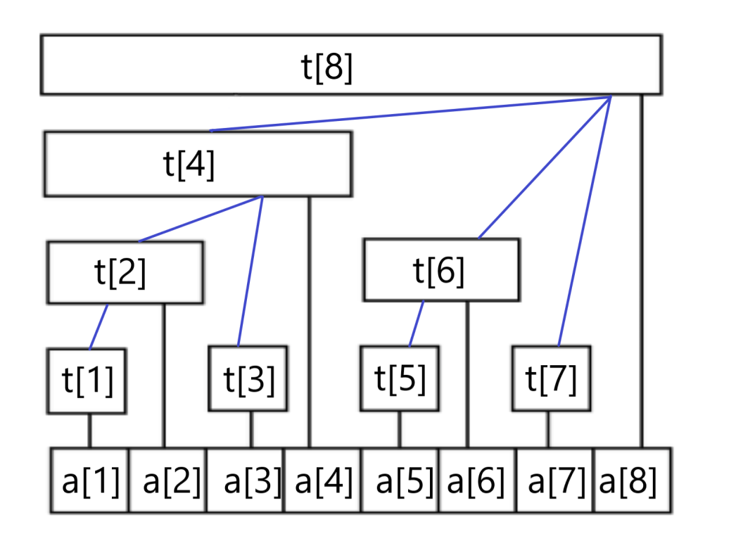 t[p] = t[p << 1] + t[p << 1 | 1]; // pushup